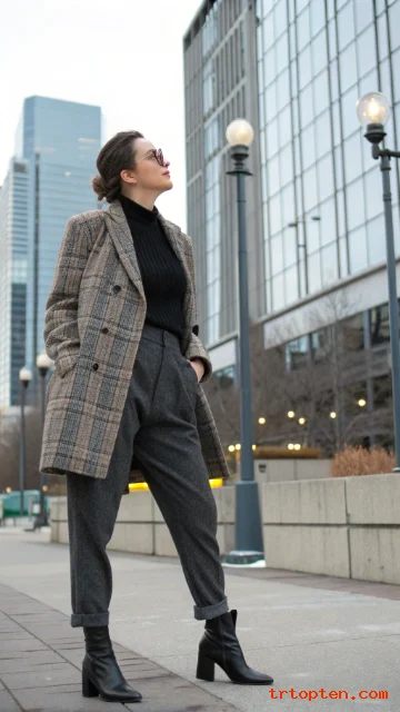 Choose a plaid blazer for a classic cold-weather mood. Use a fitted knit top so the blazer stays balanced. Add loafers with thick socks or heeled boots for a smart finish.