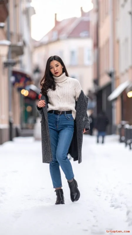Pick a sweater in cream or soft gray for a winter feel. Add a belt to define the waist and keep jeans neat. Wear a wool coat on top when the temperature drops.