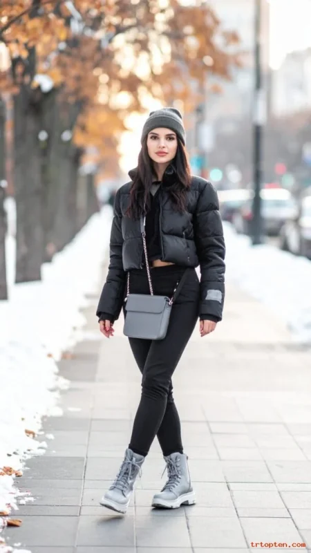 A cropped puffer jacket traps warmth and feels sporty. Black leggings keep the outfit sleek and easy to move in. Chunky sneakers balance the look and add comfort.