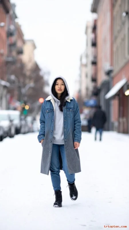 A denim jacket adds a cool casual layer. A wool coat over it keeps you warm and stylish. This layered look feels trendy and practical.