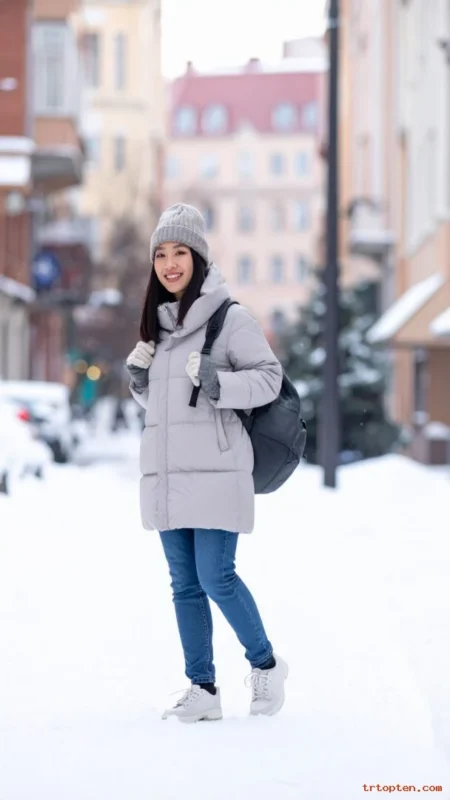 A matching beanie and gloves set looks cute and planned. A puffer jacket keeps you warm in real cold weather. Jeans add an easy everyday base.