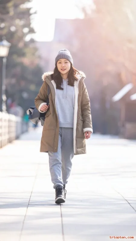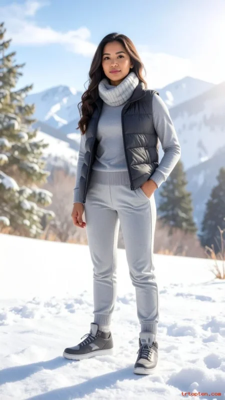 A down vest keeps your core warm without heavy sleeves. A base layer top helps trap heat close to your body. Fleece pants make the outfit perfect for cold days.