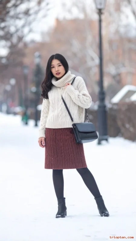 A turtleneck sweater gives warmth near your face and neck. A pleated midi skirt adds movement and a soft shape. Heels or heeled boots lift the outfit for dinner plans.