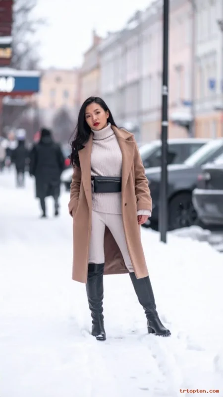 A camel wool coat gives a clean shape and a warm feel. A ribbed knit midi dress keeps the outfit soft and polished. Tall boots add coverage and make your legs look longer.