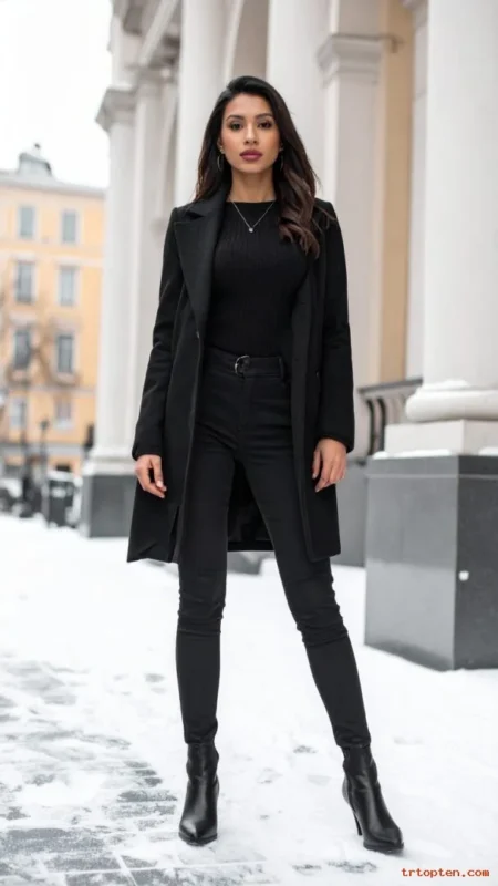 A head-to-toe black outfit looks sharp and easy. A black coat adds warmth and keeps the line clean. Black boots make the look strong and polished.