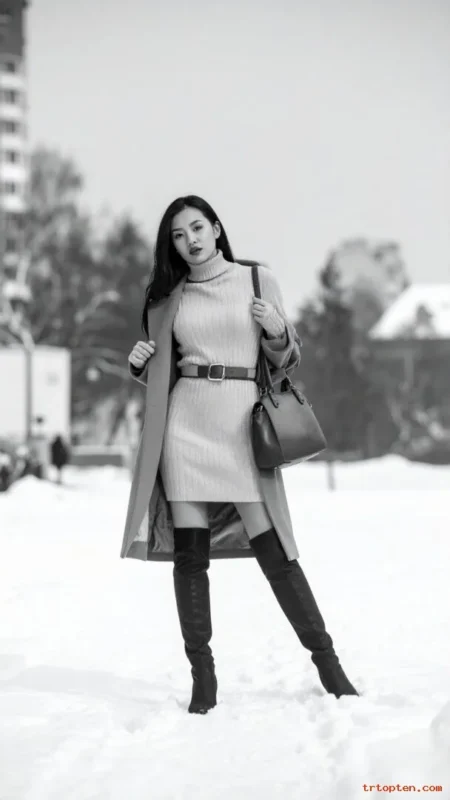 A sweater dress feels warm and easy to wear. A belt shapes the waist and adds structure. Over-the-knee boots keep your legs warm and look sleek.