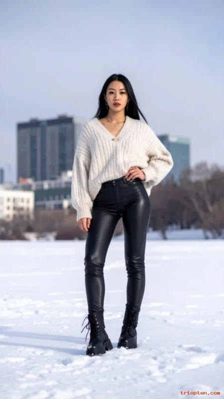 An oversized sweater feels cozy and looks effortless. Faux leather leggings add shine and contrast. This mix feels modern and flattering.