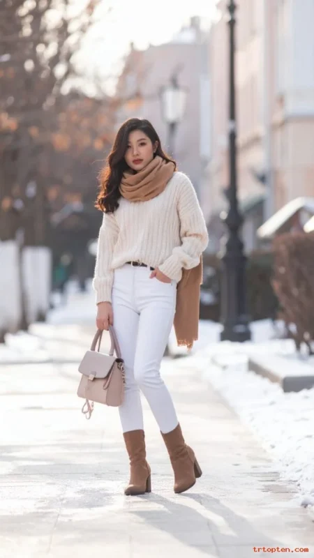 Cream and white tones look fresh in winter light. A cream sweater keeps the outfit warm and soft. Tan boots add contrast and ground the look.