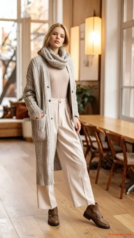 A long cardigan adds warmth without feeling heavy. A thermal top sits close to the body and layers well. Wide-leg pants create a relaxed, stylish line.
