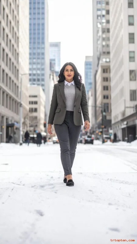Choose knit pants or wool-blend trousers for extra warmth. Add a slim scarf to frame your face and keep wind out. Wear loafers or boots based on your plans.