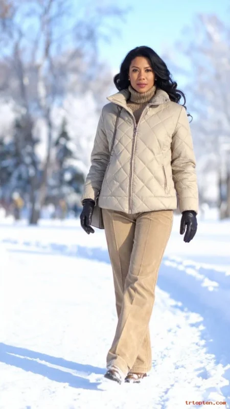 A quilted jacket feels light but holds heat. A turtleneck gives a clean base layer. Corduroy pants add texture and look perfect in winter.