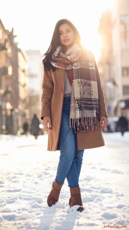 A warm scarf changes an outfit fast. Gloves and a beanie add comfort and style. A structured bag keeps the outfit looking polished.