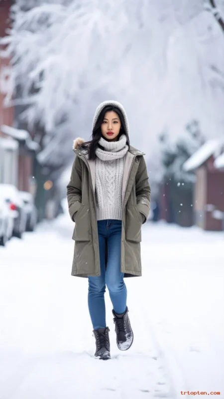 A parka blocks wind and handles cold weather well. A chunky knit sweater adds comfort and texture. Skinny jeans tuck into boots for a practical winter shape.