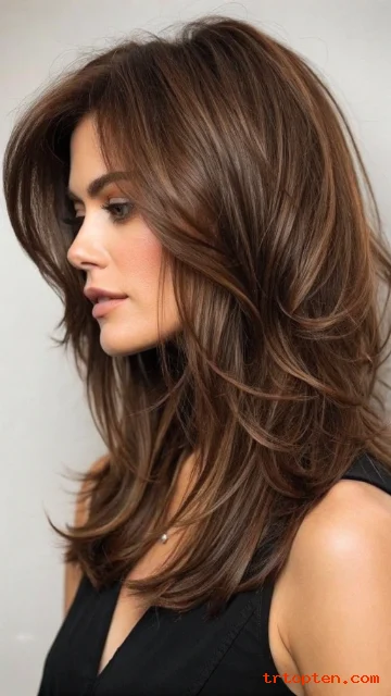 This is a smart choice if you want a change without losing long hair. It makes ponytails look fuller because of the layered crown. It also looks great with a center part.