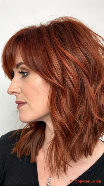 Auburn tones make wolf cut texture look warm and rich. The layers reflect light and show depth. The color adds a cozy vibe without looking dull.