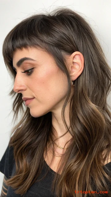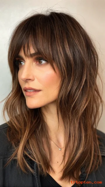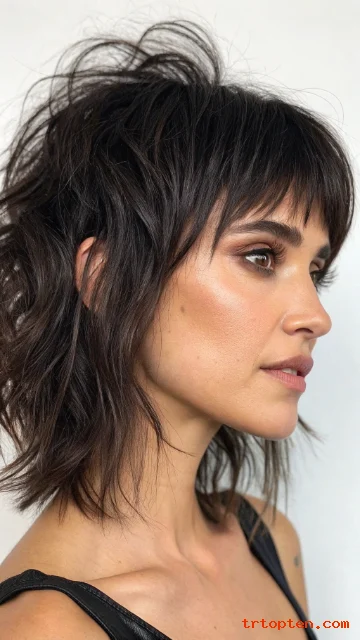 A shaggy fringe looks messy in a good way. It blends into the top layers and adds a rock-inspired vibe. The fringe sits lower and feels thicker than wispy bangs.