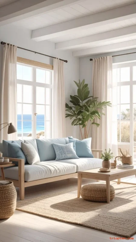 Use soft blues, sandy beige, and crisp white for a beachy mood. Add linen curtains and natural wood tones for an airy feel.