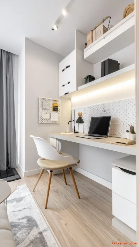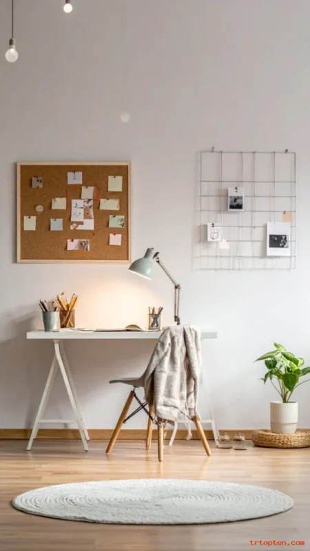 Add a pinboard or planner wall for goals and deadlines. Use a calm palette so work feels focused, not stressful.