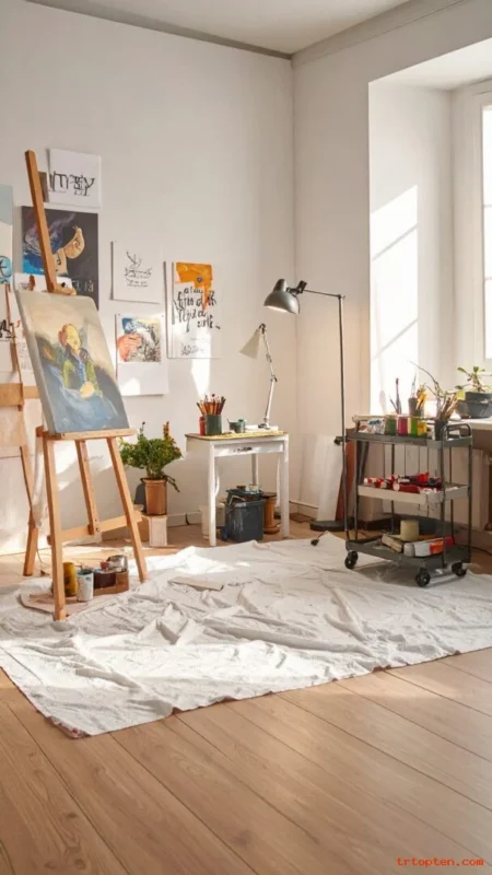 Use an easel or large table and protect floors with a drop cloth. Set a rolling cart for paints, brushes, and palettes.