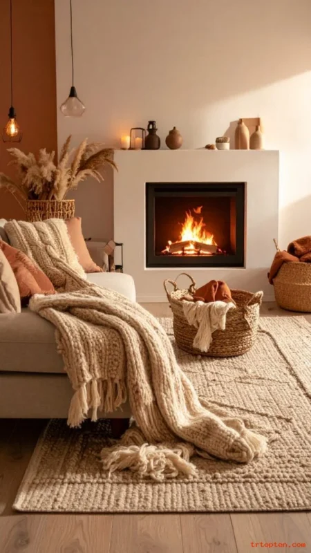 Keep the color palette warm with beige, terracotta, or caramel tones. Add a basket for blankets so the room stays tidy.