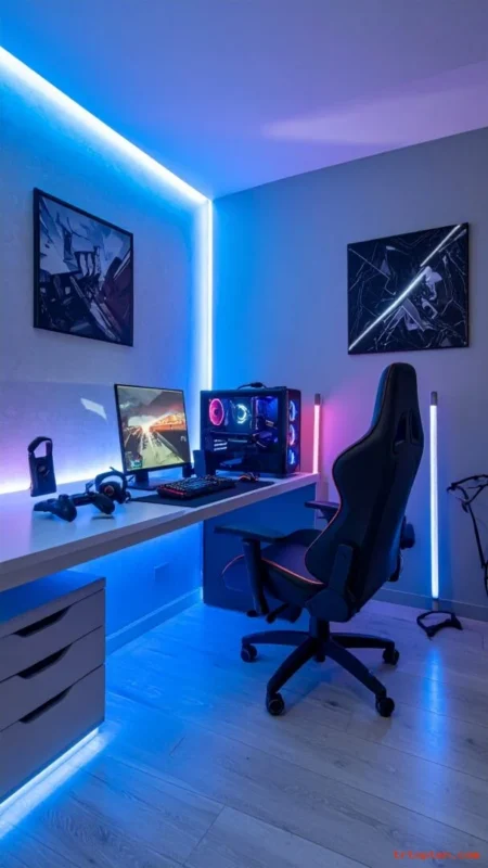 Use LED lighting behind the screen and along shelves for mood. Keep controllers, headsets, and chargers in one organizer box.