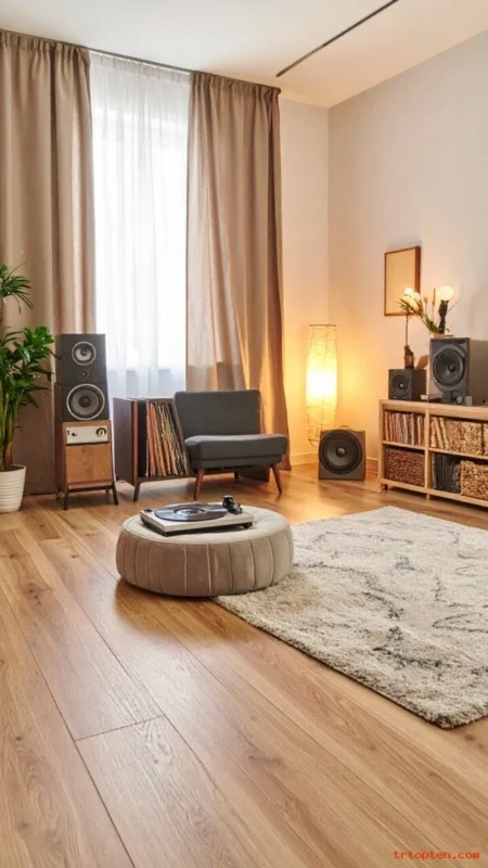 Place a thick rug and fabric curtains to soften echo and improve sound. Add a few acoustic panels if the room feels too loud.
