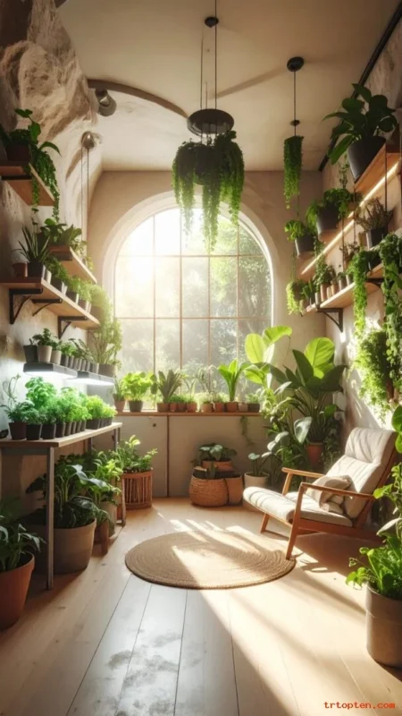 Add a plant shelf, hanging planters, and a small potting station. Use waterproof trays so watering stays clean and easy.