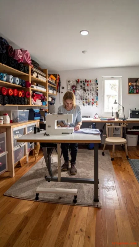 Use wall shelves for fabric stacks and clear bins for notions. Add a pegboard for scissors, rulers, and measuring tools.