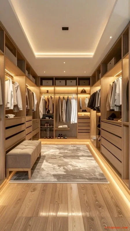 Install a full-length mirror and a small bench for trying on outfits. Add a rug for comfort and to protect floors.